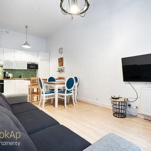 Apartament typu studio został w pełni zaprojektowany oraz przystosowany do wypoczynku max 6 osób dorosłych. Składa się z salonu połączonego z aneksem kuchennym, oddzielnej sypialni z antresolą, łazienki z WC. Wysoki standard wykończenia i gustowne dodatki nadają wnętrzu niepowtarzalnego, postindustrialnego charakteru. Doskonałe wyposażenie loftu obejmuje niezbędne meble i sprzęty: materac 2-osobowy na antresoli, 2 rozkładane sofy, krzesła, stół jadalniany, ława, TV z płaskim ekranem, lodówka, piekarnik, płyta kuchenna, zmywarka, mikrofala, czajnik elektryczny, pralka, żelazko, suszarka do włosów, odkurzacz.
