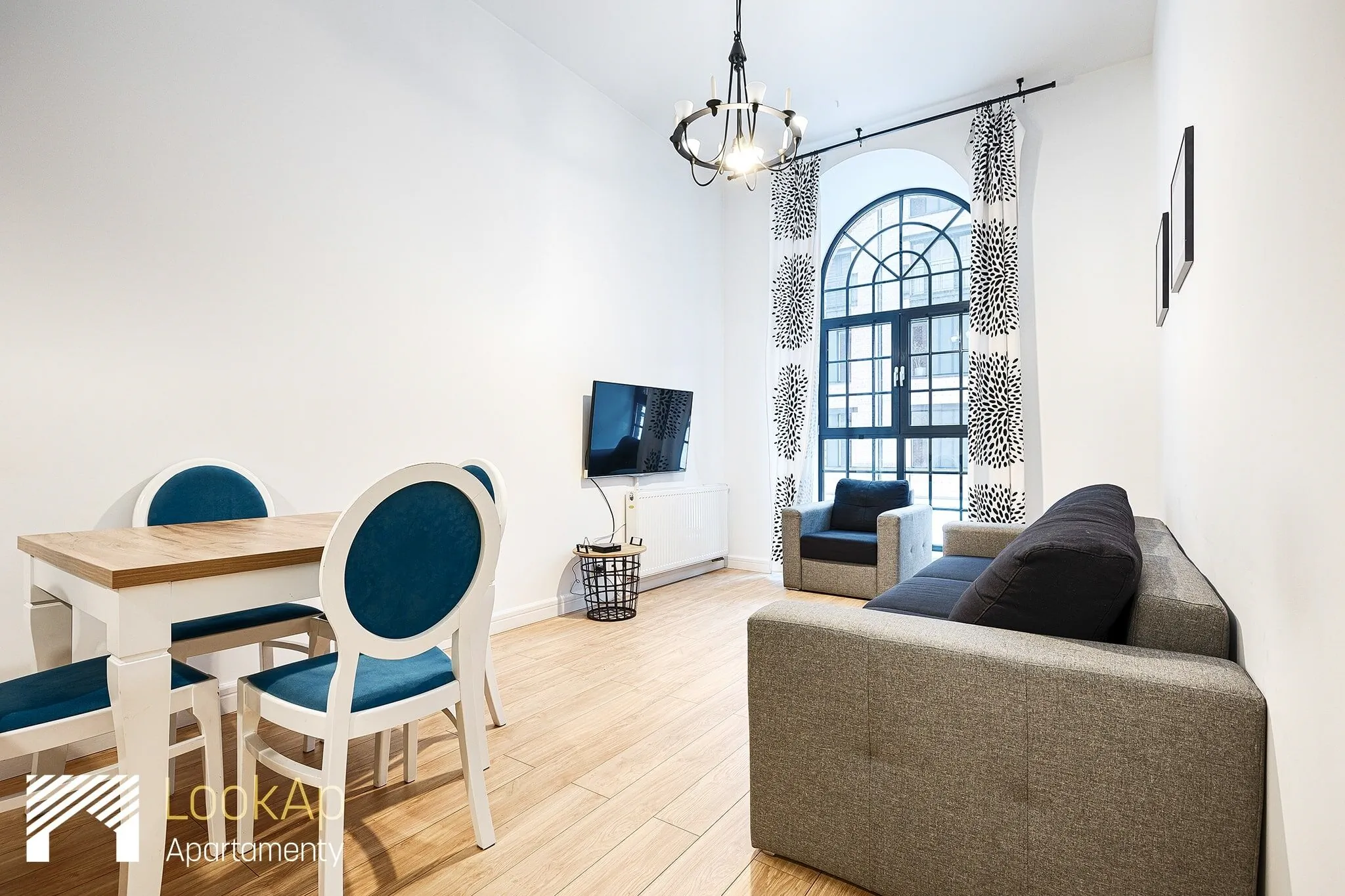 Nowocześnie urządzony loft o powierzchni około 54 m2 na parterze w budynku z windą, zlokalizowany w XIX-wiecznej zrewitalizowanej przędzalni Karola Scheiblera, w zabytkowej dzielnicy Księży Młyn w otoczeniu zieleni, pałaców i willi.