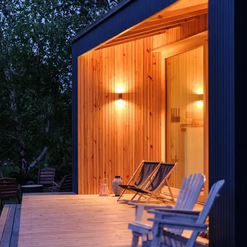 Elegancki minimalistyczny dom - tylko 50 m od jeziora Janówko o 75 m2 powierzchni mieszkalnej oraz 60 m2 tarasu z weranda w środku pięknego lasku z widokiem na jezioro.