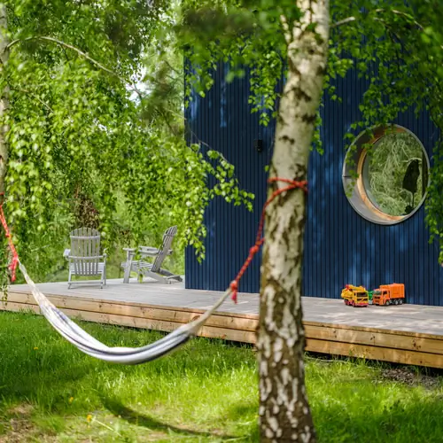 * duzo mebli ogrodowych jak hamaki, lezanki, stoly i krzesla