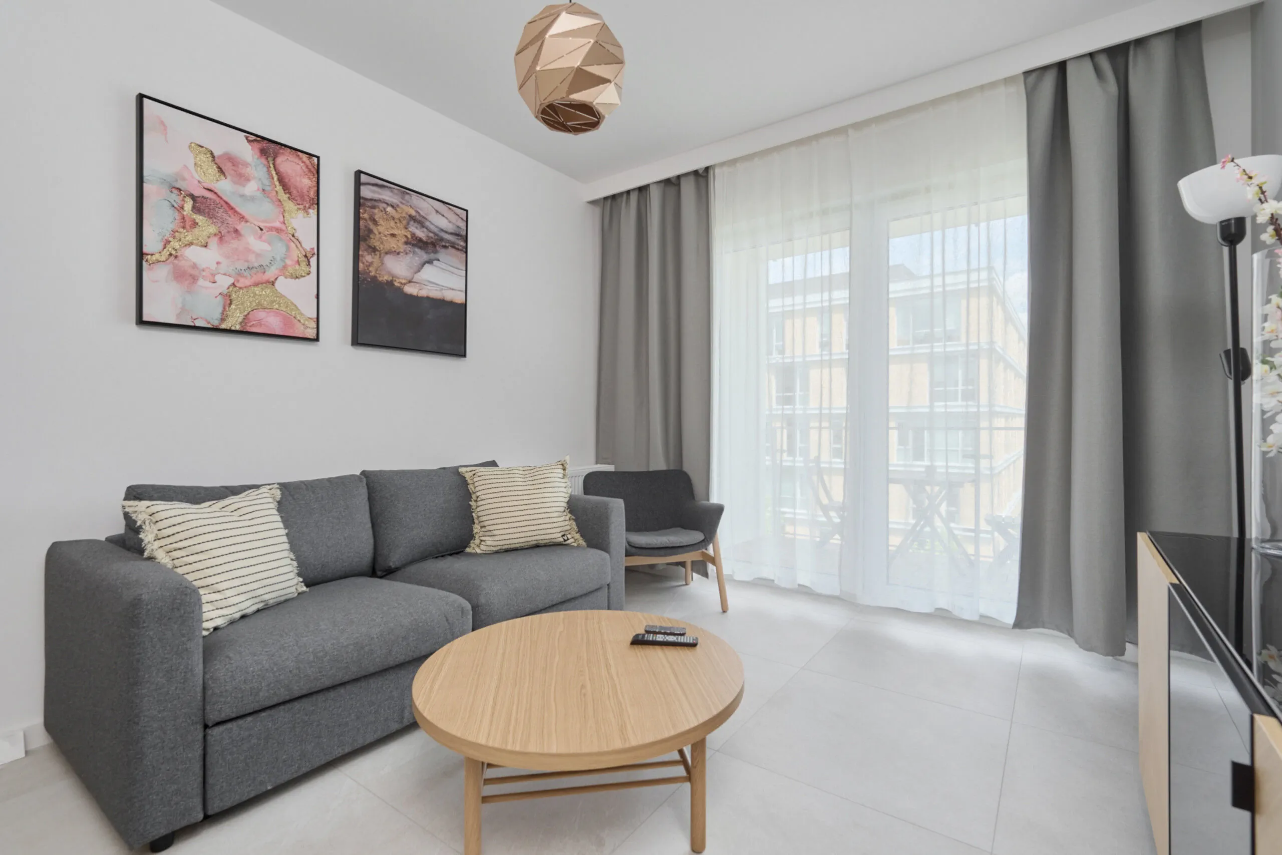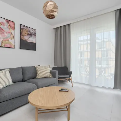 Apartament charakteryzuje się funkcjonalnym wnętrzem i przemyślanym rozplanowaniem przestrzeni z możliwością zakwaterowania 6 osób - jest świetny dla rodzin! Jest doskonałym wyborem dla podróżnych, którzy nie uznają kompromisów w kwestii stylu i komfortu. Kolorystyka wnętrz oraz wysokiej jakości wyposażenie podkreślają klimat apartamentu. Obiekt składa się z przestronnego salonu, aneksu kuchennego, łazienki z prysznicem oraz dwóch sypialni. Główna sypialnia wyposażona jest w podwójne łóżko, natomiast druga w dwa łóżka pojedyncze. W sypialni małżeńskiej znajduje się miejsce do pracy zdalnej lub nauki - wychodząc naprzeciw wszelkim potrzebom gości. Do dyspozycji jest także wygodna, rozkładana sofa w salonie. Do apartamentu przynależy także przestronny balkon - idealny na odpoczynek w ciepłe, letnie wieczory. Część dzienna z sofą oraz telewizorem typu Smart TV, to doskonałe miejsce do odpoczynku i relaksu. Szeroki wachlarz udogodnień oraz kompleksowe wyposażenie apartamentu w niezbędne akcesoria i sprzęty kuchenne, jak i łazienkowe gwarantuje komfort pobytu. Multimedia obejmują bezpłatne łącze internetowe Wi-Fi oraz telewizor z płaskim ekranem. Apartament jest idealnym miejscem na każdy rodzaj pobytu, szczególnie jeśli cenisz sobie bliskość natury i piękne wnętrza. Na dobry początek każdego noclegu zapewniony jest bezpłatny zestaw kosmetyków, ręczniki i pościel. Rodzice podróżujący z dzieckiem mają także możliwość rezerwacji łóżeczka dla swojej pociechy. Do apartamentu przynależy również prywatne miejsce parkingowe na platformie w hali garażowej, co jest atutem, szczególnie w sezonie wakacyjnym.