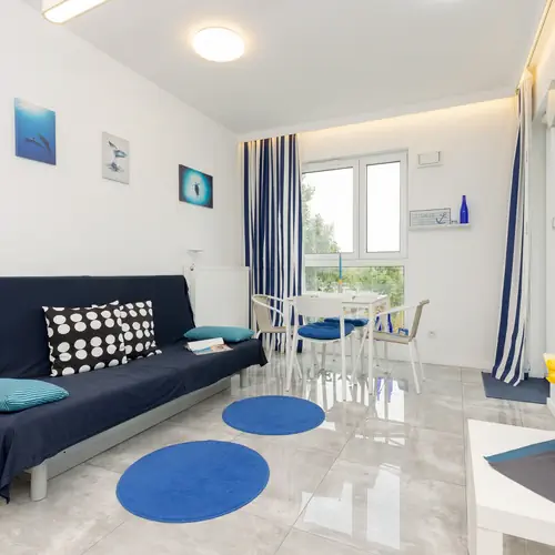 Ten komfortowy apartament oferuje wygodne zakwaterowanie, które spełni oczekiwania nawet najbardziej wymagających gości. Przestrzeń o powierzchni 31 m2 zapewni komfortowy pobyt dla 4 osób. Wnętrze apartamentu jest przytulne. Składa się on z salonu z aneksem kuchennym, balkonu, sypialni oraz łazienki z prysznicem. W salonie znajduje się telewizor, który pozwoli na relaks i rozrywkę w wolnym czasie. Na balkonie znajdują się meble ogrodowe, gdzie można zrelaksować się i cieszyć się świeżym powietrzem. Sypialnia z zapewnia komfortowy sen dla każdego z gości. Ważnym elementem apartamentu jest również dostęp do Internetu. Szeroki wachlarz udogodnień (pralka, żelazko, TV kablowa) oraz kompleksowe wyposażenie apartamentu w niezbędne akcesoria i sprzęty kuchenne, jak i łazienkowe gwarantuje komfort pobytu. Dla ułatwienia rozpoczęcia każdej wizyty zapewniony jest bezpłatny zestaw kosmetyków (mydło, szampon i żel pod prysznic), ręczniki oraz pościel.
