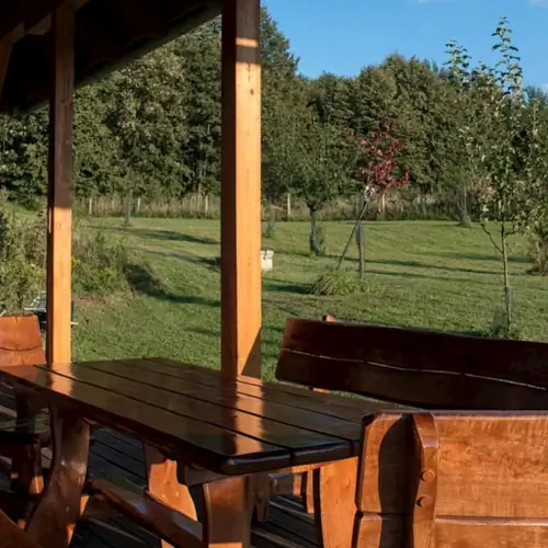 Wnętrze domku łączy rustykalny urok z nowoczesnym komfortem. Przestronna świetlica z piecem kaflowym, w pełni wyposażona kuchnia, pięć wygodnych sypialni i dwie łazienki zapewniają komfort dla całej grupy. Galeria z książkami i grami planszowymi jest idealna na wieczorne spotkania. Z tarasu roztacza się widok na ogród z drzewami owocowymi i pasącymi się końmi.