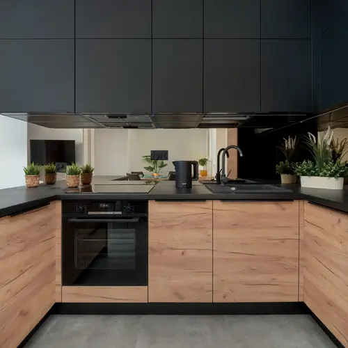 Płyta indukcyjna, piekarnik, zmywarka, pochłaniacz pary, lodówka, zamrażarka, czajnik elektryczny, kieliszki do wina.
