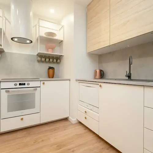 Płyta indukcyjna, piekarnik, zmywarka, pochłaniacz pary, lodówka, zamrażarka, czajnik elektryczny, kieliszki do wina.
