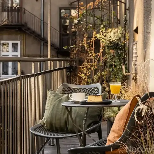 Kamienica, w której znajdują się apartamenty posiada piękny ogródek, którego samym widokiem można się zrelaksować. Cztery z apartamentów posiadają widok na podwórze, a jeden również balkon. Śniadanie jest serwowane w naszym bistro Mo-ja, znanym i lubianym przez krakowian i przyjezdnych. Tutaj również możecie Państwo spróbować pysznych lunchy i brunchy.
