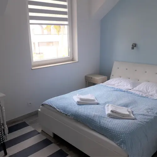 Apartament zajmuje całe piętro domu, ma 55 m² i nadaje się dla 2-6 (idealnie dla 4) osób. Składa się z 2 sypialni (jedna z dużym łóżkiem, druga z łóżkiem pojedynczym z wyciąganym łóżkiem dolnym), przestronnego pokoju dziennego z narożnikiem z funkcją spania dla 2 osób i stołem jadalnianym, w pełni wyposażonej kuchni (płyty grzewcze, piekarnik z funkcją grilla, zmywarka, mikrofala, duża lodówka z zamrażalnikiem, ekspres do kawy, toster) oraz łazienki z prysznicem i pralką. Na całej powierzchni korzystają Państwo z ogrzewania podłogowego.