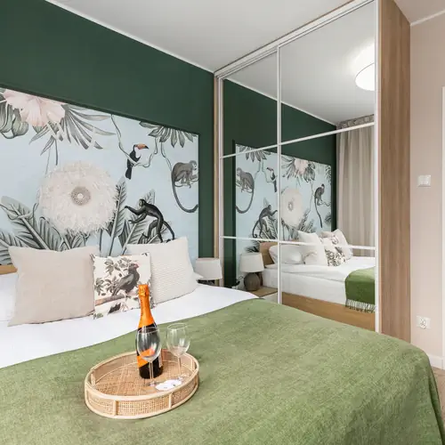 Podwójne łóżko, komplet pościeli, TV, szafa z lustrami, szafki nocne z lampkami