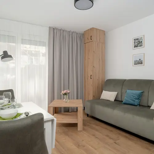 Jasne studio posiada powierzchnię 20 m² i może ugościć 2 osoby. Składa się ono z salonu, aneksu kuchennego, tarasu oraz łazienki. Wnętrza charakteryzują się wyjątkowym wystrojem, wysokiej jakości wyposażeniem oraz niezwykłą funkcjonalnością. Nasi Goście będą mogli poczuć się tutaj jak w domu i w pełni zrelaksować podczas pobytu w Poznaniu. W salonie znajduje się wygodna rozkładana sofa, która w nocy zamienia się w miejsce do spania dla 2 osób. Nowoczesny telewizor z funkcją SmartTV i dostęp do Internetu, w postaci sieci WIFI, zapewnią rozrywkę na długie wieczory.