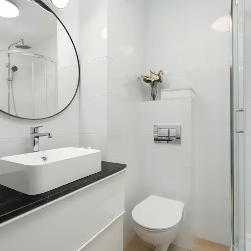 Prysznic, umywalka, lustro, ręczniki, pralka