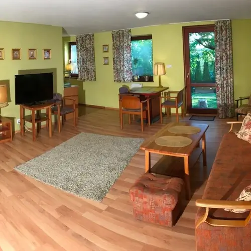 Sprzedajemy tylko pobyty z wyżywieniem. W pokojach możliwe opcje to: śniadania + obiady, śniadania + obiadokolacje, obiady + kolacje, śniadania + obiady + kolacje. W domkach oprócz wcześniej wymienionych istnieje również możliwość wykupienia samych obiadów lub samych obiadokolacji.