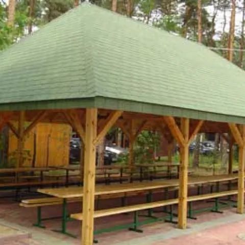 • Przed każdym domkiem i pokojami wiatki /stół i ławki pod daszkiem/ (gratis).