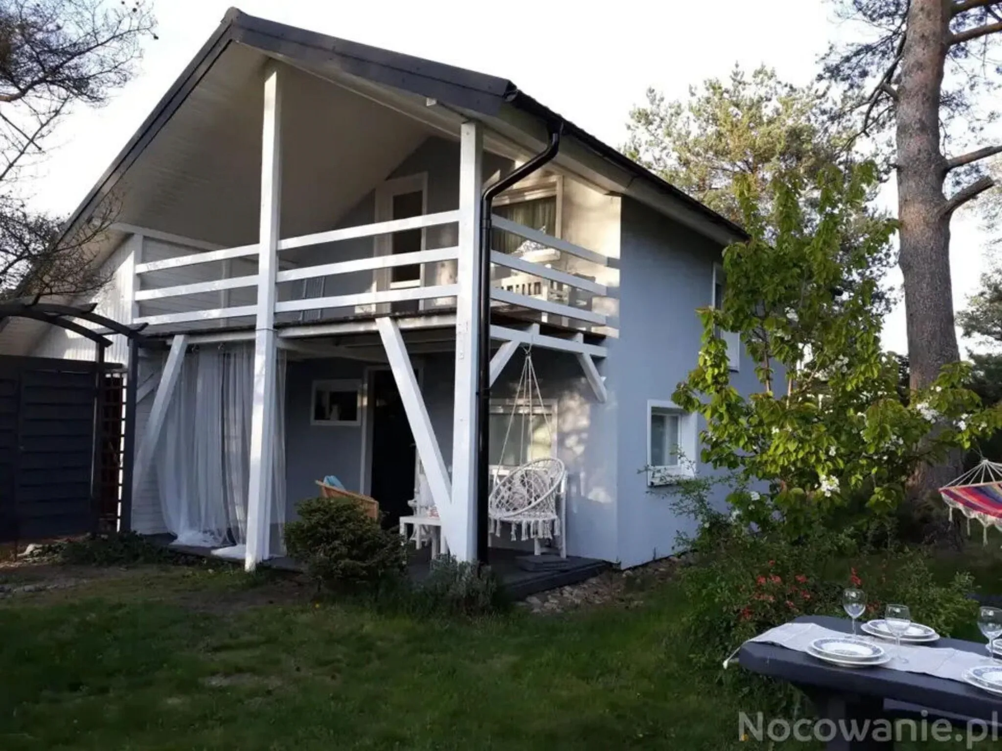 ogród- taras z huśtawką, stół i ławy, ognisko, trampolina, hamak, piaskownica, ogrodzony żywopłotem