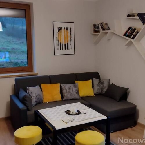 *salon z kominkiem, w którym będziesz mógł samodzielnie rozpalać ogień (dwuosobowa, rozkładana kanapa)