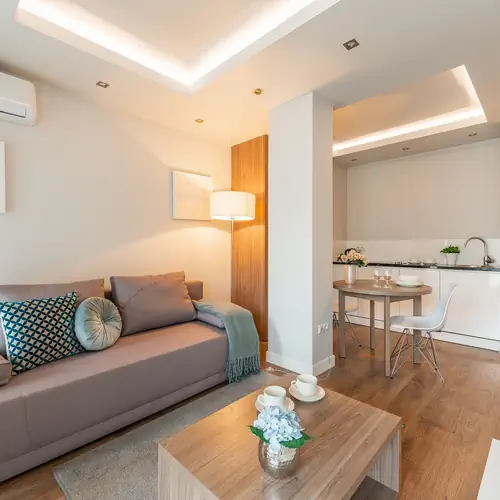 salon: sofa rozkładana, TV, stolik kawowy, stół z krzesłami