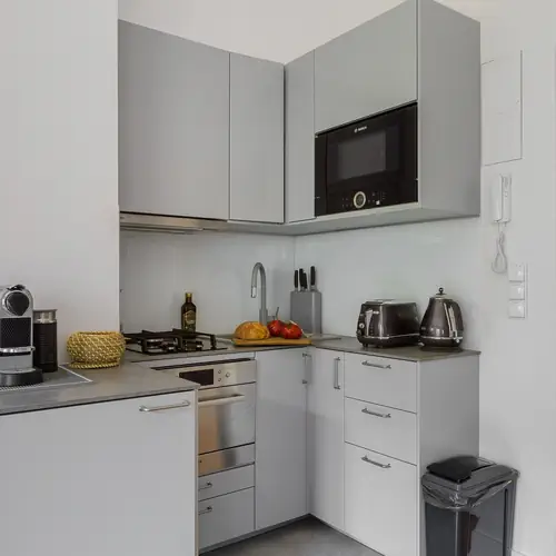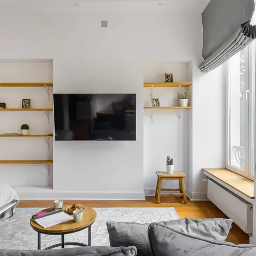 Apartament składa się z pokoju dziennego, aneksu kuchennego i łazienki