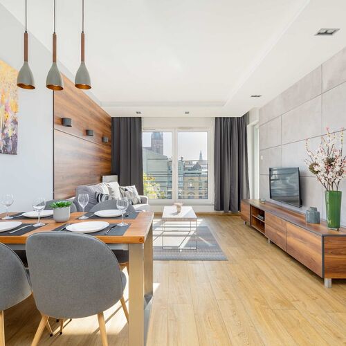 Przestronny apartament, usytuowany na czwartym piętrze, oferuje komfortowe warunki noclegowe dla czterech osób. To doskonały wybór zarówno dla rodzin, par, jak i grupy przyjaciół podróżujących wspólnie. Jasne, eleganckie wnętrza, wzbogacone o stylowe drewniane akcenty, tworzą przytulną, domową atmosferę. W przestronnym salonie znajduje się rozkładana sofa, która w ciągu dnia stanowi wygodne miejsce do relaksu, a nocą zapewnia komfortowe miejsce do spania dla dwóch osób. Aneks kuchenny został w pełni wyposażony, by spełnić oczekiwania każdego miłośnika gotowania – znajdziesz tu płytę indukcyjną, piekarnik oraz kuchenkę mikrofalową, umożliwiające przygotowanie posiłków w domowej atmosferze. Zmywarka ułatwi sprzątanie, a ekspres na kapsułki sprawi, że poranki staną się przyjemniejsze dzięki filiżance aromatycznej kawy. Sypialnia oferuje duże, podwójne łóżko, które gwarantuje spokojny i regenerujący sen. Z zarówno salonu, jak i sypialni, można wyjść na przytulny, umeblowany balkon – idealne miejsce na poranną kawę lub wieczorny relaks na świeżym powietrzu. Łazienka wyposażona jest w nowoczesną kabinę prysznicową, a dla wygody gości przygotowano komplet miękkich ręczników oraz zestaw kosmetyków. Dodatkowym udogodnieniem jest pralka, szczególnie przydatna podczas dłuższych pobytów. Apartament zapewnia nowoczesne udogodnienia multimedialne, w tym telewizor z płaskim ekranem i dostępem do kanałów kablowych oraz funkcję SmartTV+, umożliwiającą korzystanie z ulubionych aplikacji streamingowych. Szybkie WiFi dostępne jest w każdym pomieszczeniu, zapewniając wygodę korzystania z Internetu. W gorące dni ulgę przyniesie dostępny w apartamencie wiatrak. A dodatkowym atutem jest miejsce parkingowe w garażu podziemnym, gwarantujące wygodę i bezpieczeństwo.