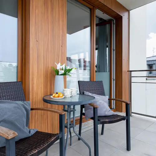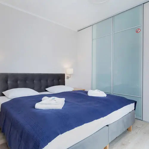 Gustownie urządzony apartament o powierzchni 60 metrów położony na trzecim piętrze ma możliwość zakwaterowania 6 osób. Przestrzeń apartamentu oferuje przestronny salon z aneksem kuchennym, sypialnię oraz łazienkę z prysznicem. Apartament wyróżnia się nowoczesny wystrojem, estetyką oraz funkcjonalnością. Część dzienna wyposażona w dwie rozkładane sofy i TV stanowi doskonałe miejsce odpoczynku i relaksu, dodatkowo w pełni wyposażony aneks kuchenny umożliwia przyrządzenie posiłków. Przestrzeń sypialni wypełnia wygodne łóżko i przestronna szafa. Apartament posiada słoneczny balkon, idealne miejsce na poranną kawę lub relaks po całym dniu zwiedzania Świnoujścia. Podróżujący z dziećmi rodzice znajdą w wyposażeniu apartamentu również łóżeczko oraz krzesełko dla swojej pociechy.