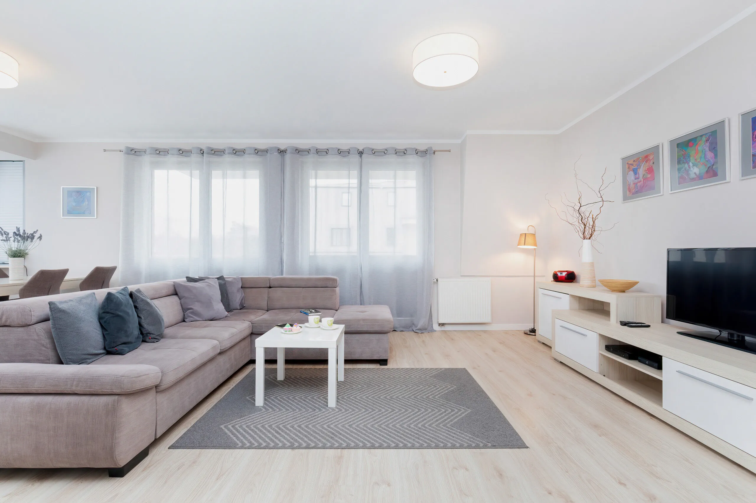 Dwie dwuosobowe rozkładane sofy, pościel, stolik kawowy, komoda, szafki, sprzęt RTV i AGD, centralne ogrzewanie, wyjście na balkon