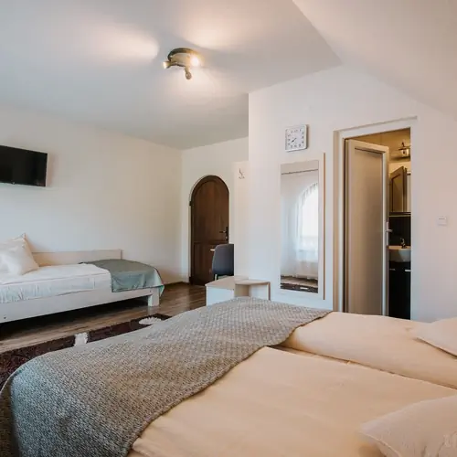 Pokoje, usługi Pensiunea Biz & SPA Corund oferuje 10 komfortowych pokoi dla gości poszukujących noclegu w Corund. Jeżeli jest taka potrzeba, możesz zostawić swój samochód na miejscu parkingowym pensjonacie bez dodatkowych kosztów. Jeżeli masz odpowiednie urządzenie przenośne, możesz podłączyć sie do Internetu poprzez bezprzewodową sieć (WiFi) dostępną w pensjonacie. Dokładne wyposażenie pokoju i dokładna dostępnych usług Pensiunea Biz & SPA Corund może być znaleziona w informatorze poniżej i w informatorze konkretnego pokoju.