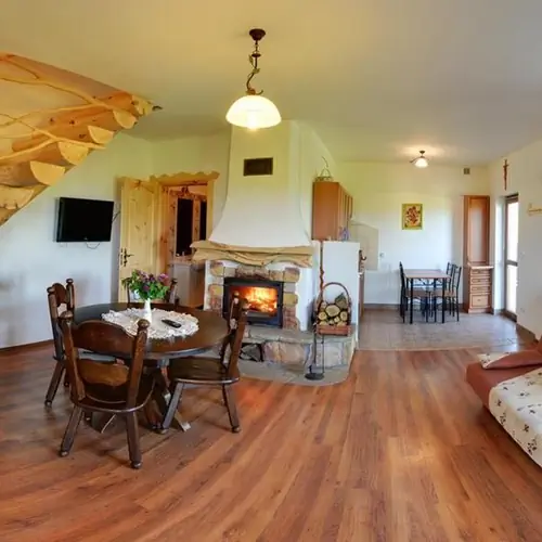 • duży salon z kominkiem i TV, w pełni wyposażony aneks kuchenny