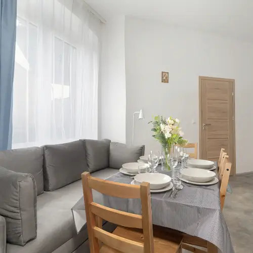Ten elegancki i stylowy apartament znajduje się na parterze. Jest on przeznaczony dla sześciu osób, dzięki czemu to wspaniały wybór dla rodziców podróżujących ze swoimi dziećmi. Lokal dysponuje umeblowanym balkonem, na którym można wypić poranną kawę lub też zjeść przekąskę. To świetna opcja dla tych, którzy lubią relaksować się na powietrzu. Aranżacja jest utrzymana w odcieniach szarości i beżu, dzięki czemu kompozycja jest stonowana i nowoczesna. W salonie stoi rozkładana sofa dwuosobowa, a także jadalniany stół z krzesłami. W pomieszczeniu znajduje się również telewizor z dostępem do kanałów naziemnych, co sprawia, że wieczorami można odpoczywać przy ulubionych programach. Możliwość wygodnego przyrządzania posiłków zapewnia funkcjonalnie wyposażony aneks kuchenny z płytą indukcyjną, kuchenką mikrofalową, kapsułkowym ekspresem do kawy oraz czajnikiem. W obu sypialniach goście mogą korzystać z podwójnego łóżka, biurka, krzesła i pojemnej szafy. Jedno z pomieszczeń zostało dodatkowo wyposażone w stolik i sofę. Łazienka ma do zaoferowania gościom prysznic, powitalny zestaw kosmetyków, ręczniki i suszarkę do włosów. Pralka dostępna jest we współdzielonym korytarzu.