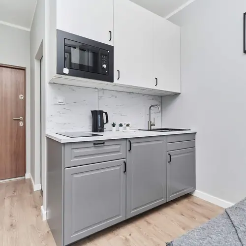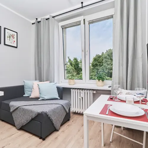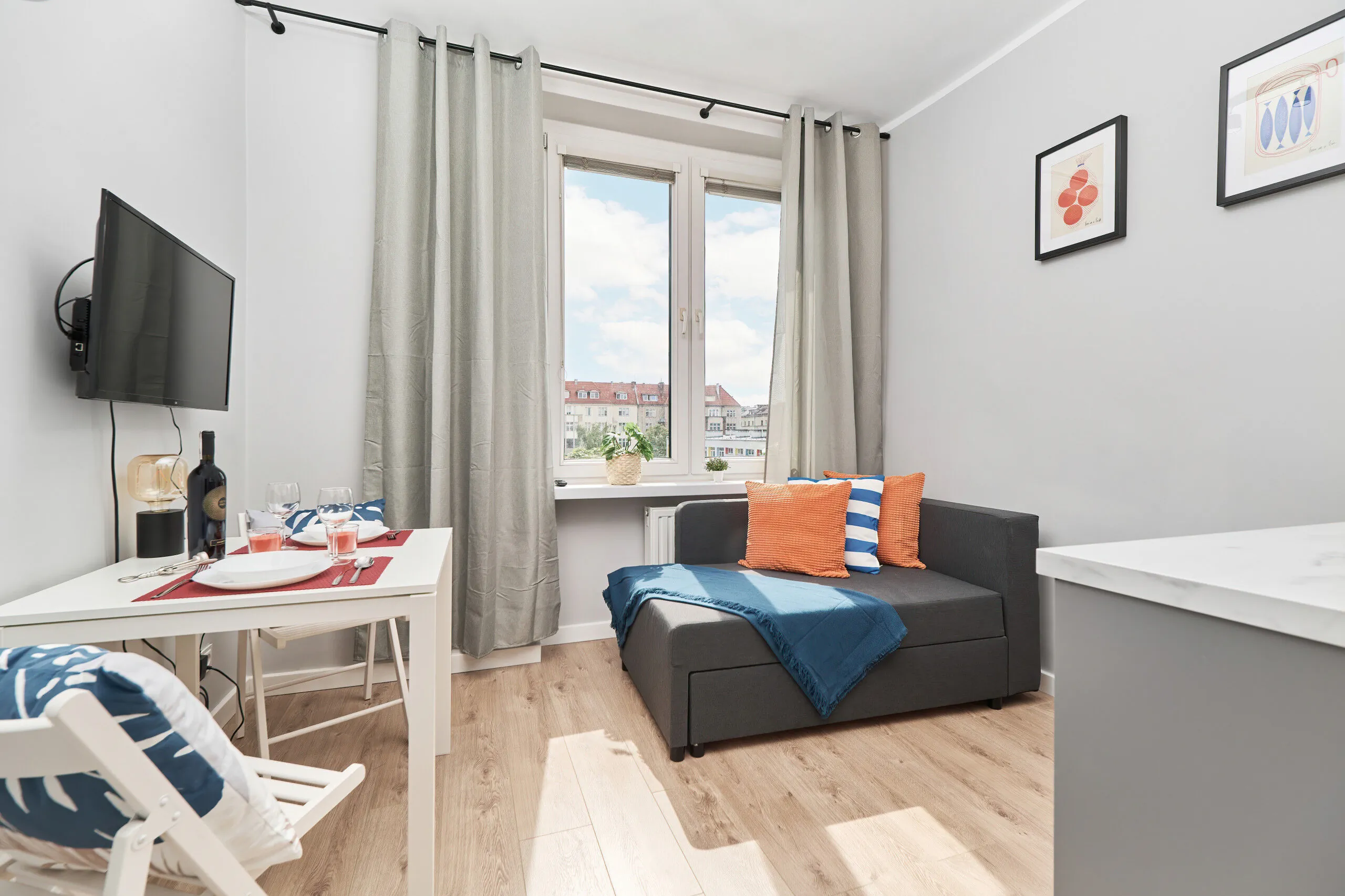 Przytulne studia idealne dla jednej osoby! Apartamenty posiadają w pełni wyposażony aneks kuchenny z płytą indukcyjną, kuchenką mikrofalową, lodówką oraz wszystkimi niezbędnymi przyborami kuchennymi. Pięknie urządzony salon wyposażony jest w telewizor z płaskim ekranem, wygodną rozkładaną sofę i dużą szafę. Łazienka wyposażona jest w kabinę prysznicową, znajdziesz tam również ręczniki i zestaw kosmetyków. Gość może również w pełni korzystać z szybkiego Internetu Wi-Fi oraz takich udogodnień jak odkurzacz, żelazko i suszarka do włosów. Dostępna jest również pralka z suszarką, która znajduje się w części wspólnej.