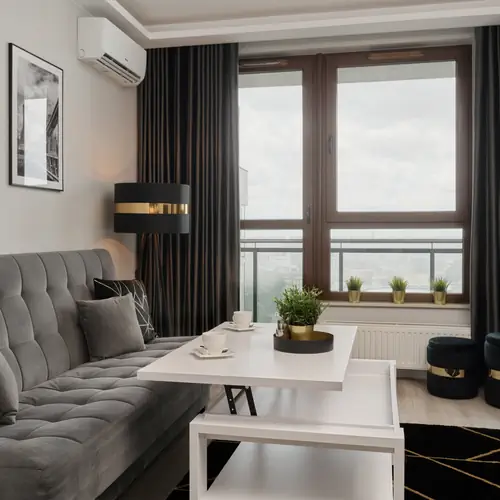 Ten klimatyzowany, stylowy apartament ma możliwość wygodnego zakwaterowania 4 osób. Doskonale sprawdzi się na wypoczynek rodzinny, pobyt biznesowy lub wypad z przyjaciółmi. Funkcjonalnie zaaranżowana powierzchnia 36 m² składa się z salonu, aneksu kuchennego, sypialni oraz łazienki z prysznicem i toaletą. Dodatkowo, apartament posiada wyjście na kameralny, przytulny balkon ze stolikiem z krzesłami, gdzie można cieszyć się poranną filiżanką kawy z widokiem na miasto. Część dzienna oferująca rozkładaną sofę oraz telewizor z płaskim ekranem, jak i sypialnia z wygodnym łóżkiem małżeńskim oraz telewizorem, stanowią doskonałe miejsce odpoczynku i relaksu. Apartament posiada również szybkie, bezpłatne łącze Wifi. Szeroki wachlarz udogodnień oraz kompleksowe wyposażenie apartamentu w niezbędne akcesoria i sprzęty kuchenne, jak i łazienkowe gwarantuje komfort pobytu. Dla ułatwienia rozpoczęcia każdego pobytu zapewniony jest bezpłatny zestaw kosmetyków (mydło, szampon i żel pod prysznic), ręczniki oraz pościel. W dodatku, podróżujący ze zwierzętami są mile widziani w tym miejscu – apartament jest przyjazny pupilom. Całość wnętrza utrzymana w modnych odcieniach szarości i bieli przykuwa uwagę swoim harmonijnym stylem. Nastrojowe oświetlenie LED w pomieszczeniach oraz modernistyczny design podbiją serca fanów nowoczesnej elegancji.
