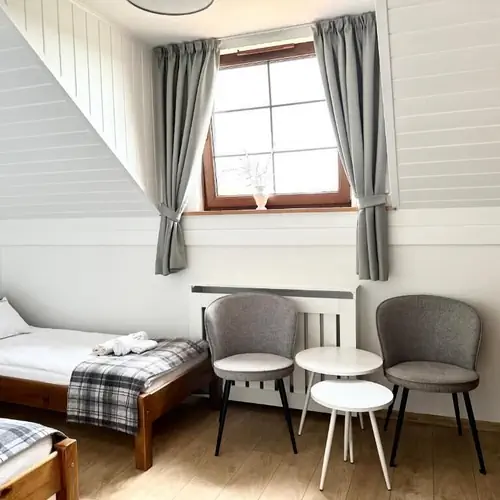 Wygodnie i nowocześnie urządzony pensjonat - pokoje z łazienkami i dostępem do nowej, świetnie wyposażonej kuchni. Kawa z ekspresu, herbata, woda niegazowana dostępne całą dobę. Salon wypoczynkowy do dyspozycji gości. Ogromny ogród, tereny leśne. Świetna obsługa. Do dyspozycji gości za dodatkową opłatą sezonowy basen z podgrzewaną wodą, kryty transparentną kopułą. Można korzystać nawet przy słabej pogodzie. Bania Ruska, sauna, domek grillowy, boisko do siatkówki plażowej. Pieski mile widziane za dodatkową opłatą. Przy pensjonacie funkcjonuje stajnia sportowa, gdzie konie i jeźdźcy mogą przebywać w harmonii z przyrodą - wielkie łąki, suche padoki, tereny leśne.
