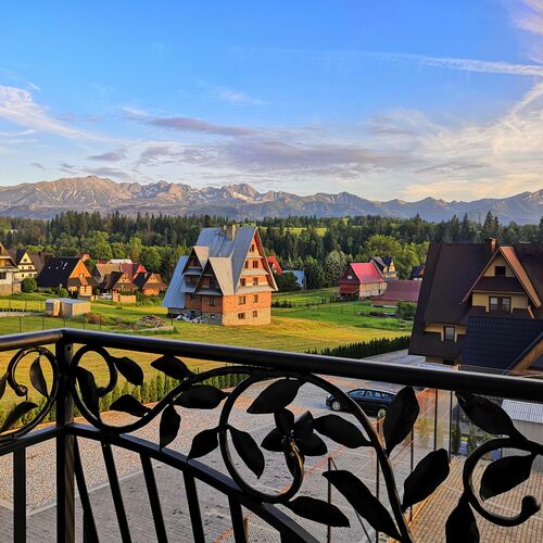 Domek o powierzchni około 60 m2 dla 6-7 osób. Na dole znajduje się komfortowy salon z tv, rozkładana sofa (z funkcją spania), wyjście na taras z którego rozpościera się rewelacyjny widok na całą panoramę Tatr, jadalnia, kuchnia wyposażona w lodówkę, zmywarkę, płytę indukcyjną, kuchenka mikrofalową, czajnik elektryczny, naczynia. Dwie łazienki (parter, piętro) z kabiną prysznicową, umywalką i wc. Dwie sypialnie w każdej z nich znajduje się łóżko małżeńskie z tv, balkon widokowy.