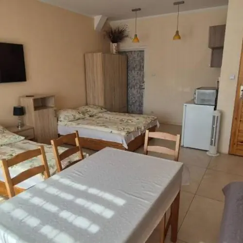 Oferujemy wygodne pokoje 2-, 3- i 4-osobowe z niezależnym wejściem, własną łazienką i zadaszonym tarasem. Każdy pokój wyposażony jest w telewizor, czajnik elektryczny, naczynia oraz parawan plażowy. W wybranych pokojach znajduje się także lodówka. Goście mają dostęp do bezprzewodowego internetu Wi-Fi. Z niektórych okien rozciąga się widok na malowniczą panoramę portu.