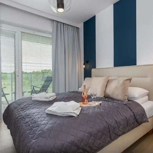 Ten w pełni wyposażony apartament z balkonem może pomieścić do 4 osób - to wygodne rozwiązanie na rodzinne wakacje lub wypad z przyjaciółmi! Składa się z salonu z aneksem kuchennym, sypialni, łazienki z prysznicem i przedpokoju oraz przestronnej garderoby. Nowoczesny wystrój z minimalistyczną paletą szarości i bieli tworzy bardzo elegancki klimat. Jest tutaj niezwykle przytulnie i domowo, dzięki czemu najwyższy standard pobytu jest gwarantowany! Nieruchomość jest kompleksowo wyposażona: jest tu bezpłatne łącze Wi-Fi i telewizor, a także sprzęt kuchenny i łazienkowy. Dodatkowo do apartamentu przynależy prywatny umeblowany balkon, na którym można się zrelaksować i cieszyć poranną filiżanką kawy czy herbaty w letni poranek. Goście mogą korzystać z prywatnego parkingu na zewnątrz.