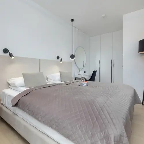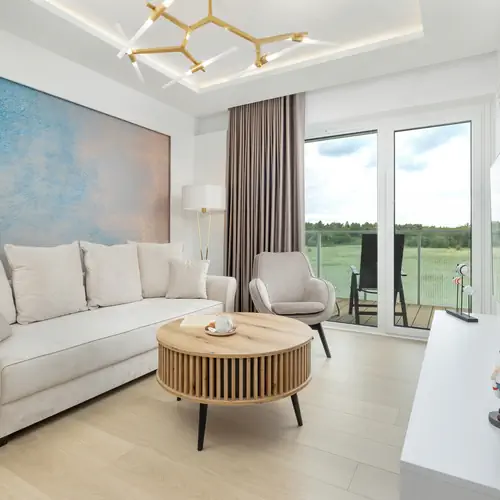 Nowoczesny apartament o wysokim standardzie może wygodnie ugościć do 4 osób. Powierzchnia 48 m² podzielona jest na salon z podwójną rozkładaną sofą, aneks kuchenny, oddzielną sypialnię z podwójnym łóżkiem oraz łazienkę z kabiną prysznicową. Panoramiczne okna wychodzą na wewnętrzną przestrzeń otoczoną zielenią, zapewniając poczucie ciszy i spokoju. Salon posiada wyjście na prywatny balkon wyposażony w meble ogrodowe - idealne miejsce do rozkoszowania się promieniami słońca. W sypialni znajduje się toaletka, która może posłużyć także jako miejsce do pracy zdalnej czy nauki. W apartamencie zaaranżowano garderobę z pojemną szafą. Wnętrze jest wykończone w jasnym i przytulnym stylu, a każdy element tworzy zarówno stylową, jak i funkcjonalną przestrzeń. Funkcjonalność jest dodatkowo zwiększona dzięki bogatemu wyposażeniu i udogodnieniom. Udogodnienia te obejmują multimedia (telewizor Smart TV z płaskim ekranem – w salonie i sypialni oraz bezpłatne łącze Wi-Fi) oraz pełne wyposażenie łazienkowe i kuchenne, takie jak pralka, ekspres do kawy (przelewowy), piekarnik, toster, zmywarka. Aby ułatwić rozpoczęcie pobytu, zapewniono bezpłatny zestaw kosmetyków, ręczniki i pościel. Goście podróżujący samochodem mają do dyspozycji prywatne miejsca parkingowe w garażu podziemnym, co jest atutem szczególnie podczas wakacji na Wybrzeżu. Wysublimowany i estetyczny wystrój z wieloma udogodnieniami oraz wyposażeniem najwyższej jakości zapewnia maksymalny komfort pobytu.