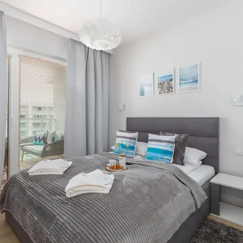 Ten w pełni wyposażony apartament z balkonem o powierzchni 39 m² może pomieścić do 4 osób - to wygodne rozwiązanie na rodzinne wakacje lub wypad z przyjaciółmi! Część mieszkalna składa się z salonu z aneksem kuchennym, sypialni oraz łazienki z prysznicem i przedpokoju. Dodatkowo, do mieszkania przynależy prywatny umeblowany balkon, gdzie można wypocząć i w letni poranek cieszyć się smaczną kawą na świeżym powietrzu. Apartament posiada dostęp do szybkiego bezpłatnego Internetu Wifi. W pełni wyposażony aneks kuchenny umożliwia przyrządzenie pysznych, domowych posiłków. Szeroki wachlarz udogodnień oraz kompleksowe wyposażenie apartamentu w niezbędne akcesoria i sprzęty kuchenne, jak i łazienkowe gwarantuje komfort pobytu. Dla ułatwienia rozpoczęcia każdego pobytu zapewniony jest bezpłatny zestaw kosmetyków (mydło, szampon i żel pod prysznic), ręczniki oraz pościel. Obiekt wyposażony jest we wszystko, co potrzebne do odpoczynku i relaksu. Rodzice podróżujący z dzieckiem mogą również znaleźć na wyposażeniu łóżeczko i krzesełko dla swojej pociechy. Nowoczesne wnętrze utrzymane w minimalistycznej palecie bieli i szarości, z dodatkiem niebieskich elementów, tworzy bardzo elegancki klimat. Obiekt charakteryzuje się morskim wystrojem, estetyką oraz funkcjonalnością, wychodząc naprzeciw wszelkim potrzebom gości.
