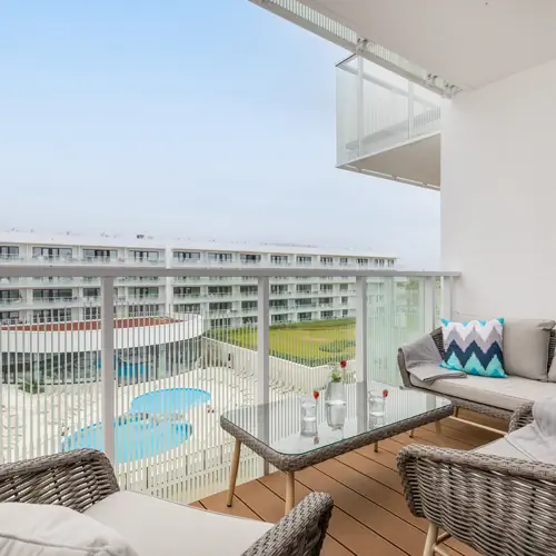 Ten nowoczesny i luksusowy apartament z jedną sypialnią znajduje się na terenie osiedla Polanki Aqua, przy ulicy Wydmowej w Kołobrzegu. Stanowi idealną lokalizację na spokojny, rodzinny wypoczynek! W kompleksie do dyspozycji gości jest taras widokowy i basen wewnętrzny z otwartym pawilonem spełniającym funkcję pool baru. (aby wejść na taras i teren basenu, należy posiadać opaskę magnetyczną/zegarek - w apartamencie są 4 sztuki). Do dyspozycji gości jest także pokój zabaw dla dzieci oraz restauracja z tarasem. Goście mogą również oddać się relaksowi w strefie SPA lub aktywnie spędzić czas na siłowni. Dostęp do wszystkich tych udogodnień jest dla naszych gości bezpłatny. Obiekt położony zaledwie 800 metrów od pięknej, piaszczystej Plaży Zachodniej Radzikowo. Apartament oddalony jest około 3,5 km od Oceanarium oraz nieco ponad 4 km od Latarni Morskiej i kołobrzeskiego molo. W okolicy obiektu znaleźć można również wypożyczalnie rowerów.
