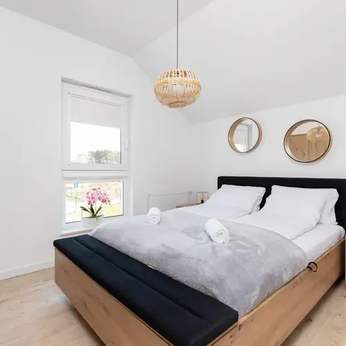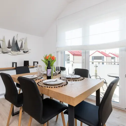 Nowoczesny i klimatyzowany apartament z możliwością zakwaterowania 6 osób składa się z salonu z aneksem kuchennym, dwóch sypialni oraz łazienki z prysznicem. Przestrzeń salonu wypełnia rozkładana sofa, a sypialni - wygodne łóżka. Wysublimowany wystrój apartamentu oraz wysokiej jakości wyposażenie gwarantują komfortowy pobyt. Apartament posiada balkon wyposażony w meble ogrodowe, który stanowi idealne miejsce wypoczynku na świeżym powietrzu. Kompleksowe wyposażenie apartamentu, telewizor z płaskim ekranem, dostępność sieci WiFi oraz niezbędne akcesoria kuchenne i łazienkowe zapewniają niezapomniany pobyt w nadmorskim otoczeniu. Do dyspozycji gości są prywatne miejsca parkingowe przed budynkiem, co stanowi atut szczególnie w sezonie turystycznym.