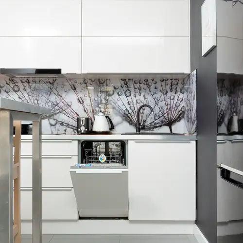 Blat z krzesłami, lodówka z zamrażarką, płyta elektryczna, zmywarka, piekarnik, czajnik elektryczny, toster, zastawa stołowa i kuchenna