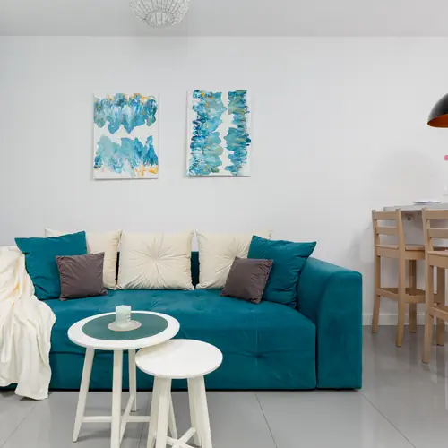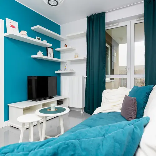 Nowoczesny apartament może wygodnie ugościć do 4 osób. Powierzchnia 35 m² podzielona jest na salon z podwójną rozkładaną sofą, aneks kuchenny, oddzielną sypialnię z podwójnym łóżkiem oraz łazienkę z wanną. Salon posiada wyjście na zamykany prywatny taras od strony podwórka. Taras, wyposażony w meble ogrodowe, jest doskonałym miejscem na poranną kawę lub posiłek w ciepłe letnie dni. Wnętrze apartamentu jest stylowo wykończone w biało-niebieskiej kolorystyce, a pełne wyposażenie dba o komfort każdego pobytu. Udogodnienia obejmują multimedia (telewizor z płaskim ekranem i dostępem do kanałów satelitarnych oraz bezpłatne łącze Wi-Fi) oraz pełne wyposażenie łazienkowe i kuchenne, takie jak pralka i zmywarka. Na dobry początek pobytu zapewniono bezpłatny zestaw kosmetyków, ręczniki i pościel. Goście podróżujący samochodem mogą zaparkować za darmo na prywatnym miejscu w podziemnym parkingu.