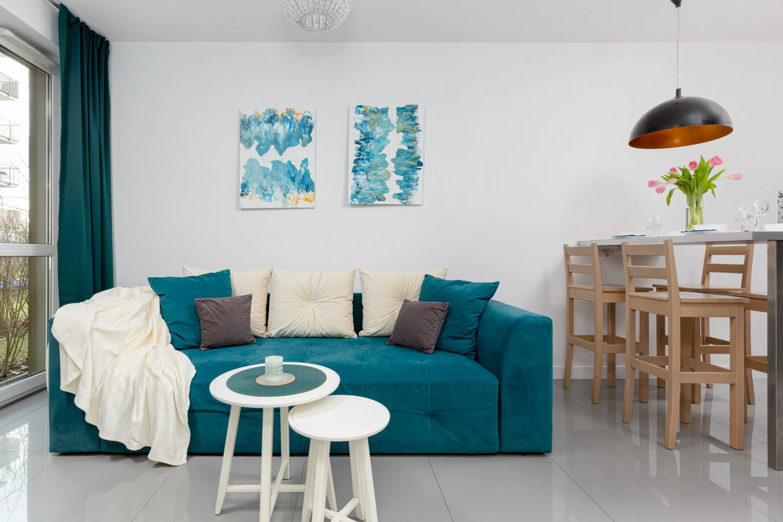 Podwójna rozkładana sofa, TV, stolik kawowy, wyjście na taras