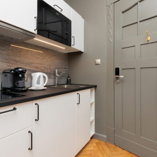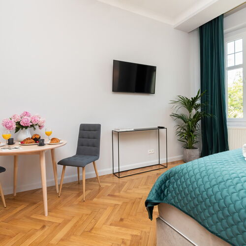 Stylowe studio może zapewnić wygodne zakwaterowanie dla 2 osób. 30m² powierzchni składa się z pokoju z aneksem kuchennym, oraz łazienki z prysznicem. Komfortowe wnętrze przywodzi na myśl pobyt w luksusowym hotelu, a stylowy wystrój łączy się z przemyślaną kolorystyką. Nawet w szczycie lata w studiu panuje optymalna temperatura dzięki klimatyzacji. Studio jest również funkcjonalnie umeblowane w podwójne duże łóżko, szafę oraz kącik jadalny ze stołem i krzesłami. Kompleksowe udogodnienia, w tym multimedia (bezpłatne szybkie łącze WiFi oraz telewizor z płaskim ekranem) oraz sprzęt AGD (pralka, mikrofalówka, ekspres do kawy, suszarka do włosów) są gwarancją udanego pobytu. Na dobry początek wypoczynku zapewniamy naszym gościom bezpłatny zestaw kosmetyków, ręczniki i pościel.