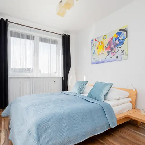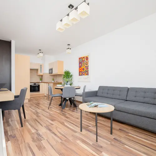 Jasny apartament może ugościć 4 osoby i posiada powierzchnię 45 m². Został zaprojektowany w przyjemnych kolorach beżu, szarości oraz bieli i wyposażony w niezwykle funkcjonalne oraz stylowe meble. Przestrzeń mieszkania składa się z salonu, osobnej sypialni, aneksu kuchennego, balkonu oraz łazienki z prysznicem. W salonie znajduje się podwójna rozkładana sofa, stół z krzesłami, biurko oraz nowoczesny telewizor z funkcją SmartTV. W apartamencie zapewniony jest dostęp do WIFI, dzięki czemu nasi Goście będą mogli oglądać swoje ulubione filmy i seriale. Osobna sypialnia wyposażona jest w podwójne łóżko, szafki nocne i pościel. W aneksie kuchennym dostępne są wszystkie niezbędne przybory do przygotowywania posiłków. Posiada on również takie udogodnienia jak zmywarka, kuchenka mikrofalowa, piekarnik oraz lodówka z zamrażarką. W łazience znajduje się kabina prysznicowa, pralka, suszarka do włosów oraz ręczniki dla naszych Gości. W apartamencie zapewniona jest oczywiście świeża pościel. Apartament z przyjemnością ugości również Państwa zwierzęta domowe i posiada miejsce parkingowe w garażu podziemnym.