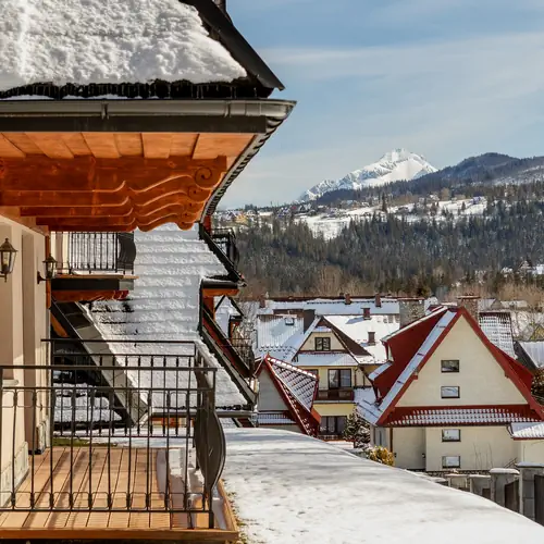 Ten ekskluzywny, w pełni wyposażony apartament z widokiem na Tatry o powierzchni 51 m² może pomieścić 5 osób, co czyni z niego idealną opcję dla gości podróżujących rodzinnie czy dla grupki znajomych. Goście poczują w nim iście góralski klimat, dzięki drewnianemu wnętrzu i klimatycznym dekoracjom. Mieszkanie składa się z przestronnego salonu z aneksem kuchennym, przytulnej sypialni oraz łazienki z prysznicem i toaletą. W części dziennej goście znajdą komfortową, rozkładaną sofę, a w sypialni niezwykle wygodne dwuosobowe łóżko i wygodny rozkładany fotel. Do mieszkania przynależy również taras, gdzie można napić się porannej kawy na świeżym powietrzu, czy zrelaksować w sąsiedztwie natury i z pięknym widokiem na góry. W apartamencie dostępne są dwa duże telewizory 55 cali (w sypialni i salonie) oraz szybkie łącze Wi-Fi. Do dyspozycji gości jest również aneks kuchenny wyposażony w najpotrzebniejsze sprzęty do samodzielnego przyrządzania posiłków, takie jak mikrofalówka, zmywarka czy ekspres do kawy. Łazienka cechuje się elegancką prostotą – można znaleźć w niej prysznic, toaletę, pralkę, suszarkę do włosów, lustro i ręczniki, a to wszystko w stylowo urządzonym wnętrzu. Szeroki wachlarz udogodnień oraz kompleksowe wyposażenie apartamentu w niezbędne akcesoria i sprzęty kuchenne, jak i łazienkowe gwarantuje komfort pobytu. Dla ułatwienia początku pobytu zapewniono bezpłatny zestaw kosmetyków, ręczniki i pościel. Obiekt wyposażony jest we wszystko, co potrzebne do odpoczynku i relaksu. W obiekcie istnieje możliwość pobytu ze swoim ulubionym pupilem, gdyż apartament jest przyjazny zwierzętom.