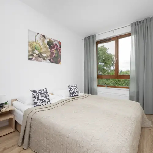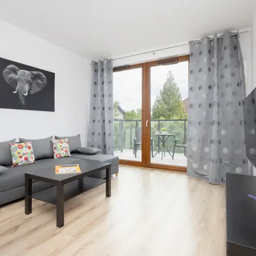Ten nowoczesny i jasny apartament jest idealny na pobyt dla maksymalnie czterech osób. Został zaprojektowany z myślą o wygodzie i funkcjonalności, doskonale nadaje się zarówno na krótsze, jak i dłuższe pobyty. W głównym pomieszczeniu znajduje się rozkładana sofa oraz telewizor zapewniający rozrywkę. Z sypialni jest wyjście na umeblowany balkon, z którego roztacza się widok na ogród. Balkon jest wyposażony w meble ogrodowe, co tworzy przyjemną przestrzeń do wypoczynku na świeżym powietrzu, idealną na poranną kawę lub wieczorny relaks.