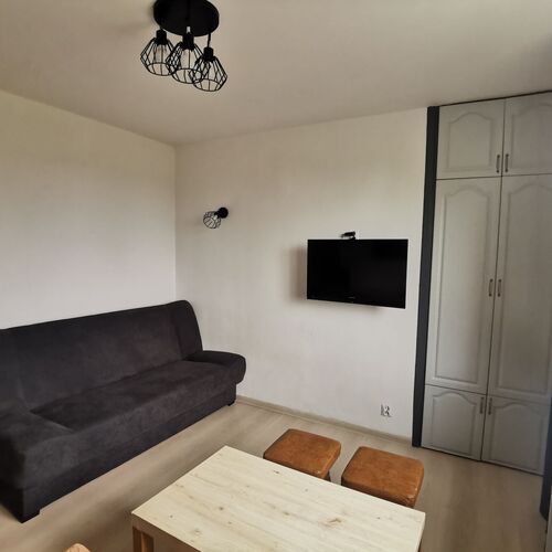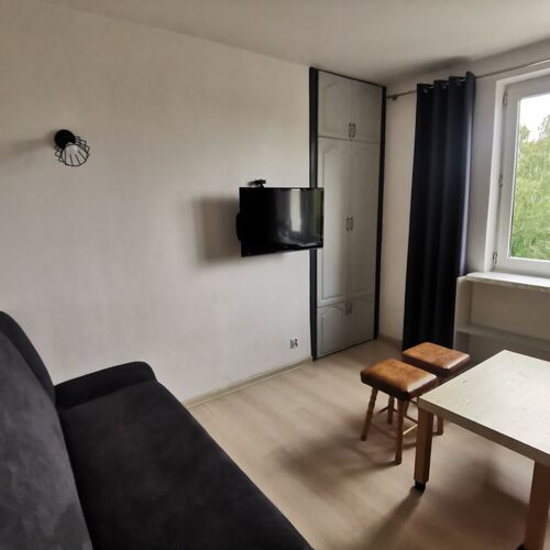 Kawalerka jest niewielka, przeznaczona dla 2 osób z dzieckiem. Jest urządzona bardzo funkcjonalnie, dzięki meblom w zabudowie wykonanym na wymiar. W pokoju jest dwuosobowa kanapa i rozkładana sofa, duża szafa wnękowa, regał i komoda. Przedpokój jest połączony z aneksem kuchennym.