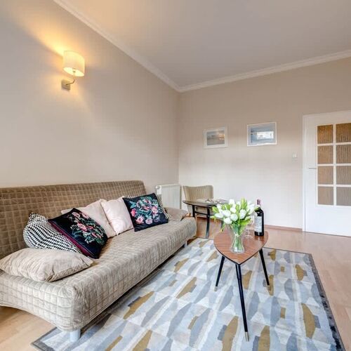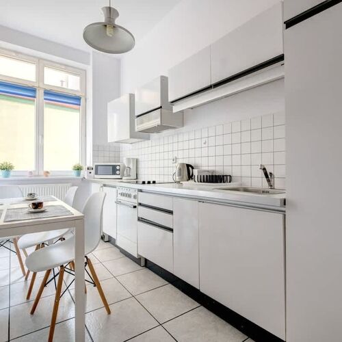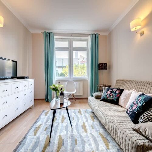 Ten stylowy i przytulny apartament jest przeznaczony dla czterech osób. Znajduje się on na parterze. Lokal został urządzony z dbałością o funkcjonalne wykorzystanie dostępnej przestrzeni, estetyczny wygląd i komfort użytkowania pomieszczeń. W salonie stoi rozkładana sofa dwuosobowa, szafka idealna do przechowywania podręcznych drobiazgów oraz telewizor, przy którym można relaksować się wieczorami, oglądając ulubione programy w telewizji kablowej. Oddzielna kuchnia umożliwia wygodne przygotowywanie i spożywanie posiłków. Została ona wyposażona w takie sprzęty jak kuchenka elektryczna, piekarnik, czajnik elektryczny czy też kuchenka mikrofalowa. W sypialni znajduje się wygodne łóżko dwuosobowe i stylowe białe szafki. Łazienka ma do zaoferowania gościom pralkę, prysznic, suszarkę do włosów i powitalny zestaw kosmetyków z ręcznikami. W wystroju dominują subtelne barwy, co sprawia, że apartament prezentuje się gustownie i elegancko. To doskonałe miejsce do wypoczynku zarówno podczas krótkich wycieczek, jak i długich pobytów.