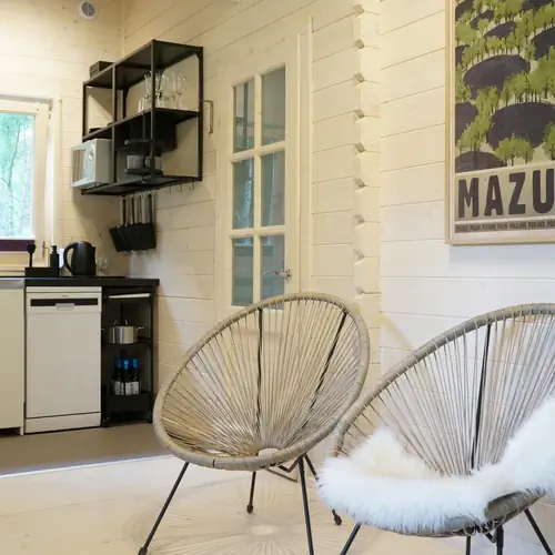 Kuchnia jest w pełni zaopatrzona. Zapewniono 2 palnikową płytę grzewczą, lodówkę, zmywarkę, mikrofalówkę, czajnik elektryczny oraz kolbowy ekspres do kawy. Kuchnia wyposażona jest też w garnki, talerze, szklanki, kieliszki oraz sztućce. W łazience jest prysznic.