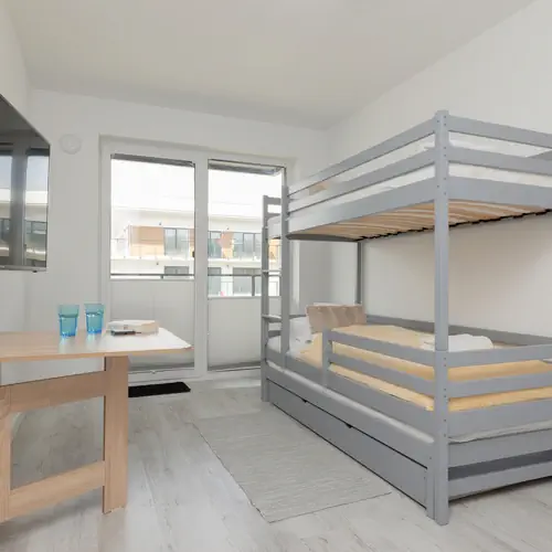 Piętrowe łóżko dla 3 osób (jedno z nich jest rozsuwane z dołu), stolik, TV, wyjście na balkon, duża szafa