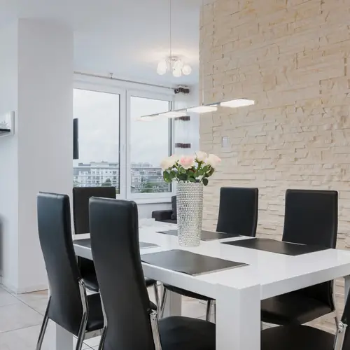 Stół z 6 krzesłami, czajnik, zmywarka, ekspres do kawy, toster, kuchenka mikrofalowa, płyta indukcyjna, piekarnik, lodówka z zamrażalką, szklanki, zestaw garnków, sztućców, patelnia, wyjście na balkon