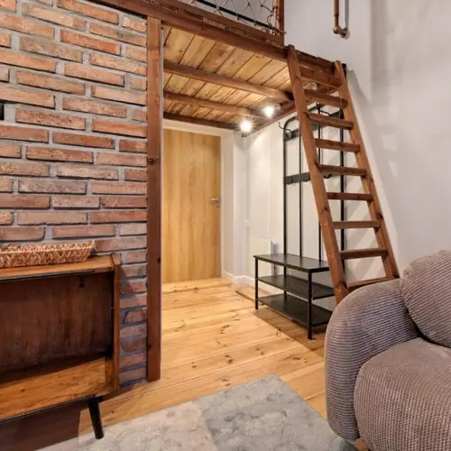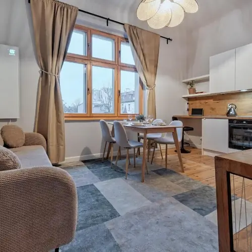 W układ studia wchodzi pokój z sofą rozkładaną i wyjściem na mały balkon, funkcjonalnym aneksem kuchennym i łazienką z prysznicem. Goście mają do dyspozycji pełne wyposażenie mieszkania wraz z dostępem do WiFi. Lokal skierowany jest ulicę, jednakże posiada nowe okna z funkcją wyciszenia.
