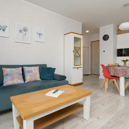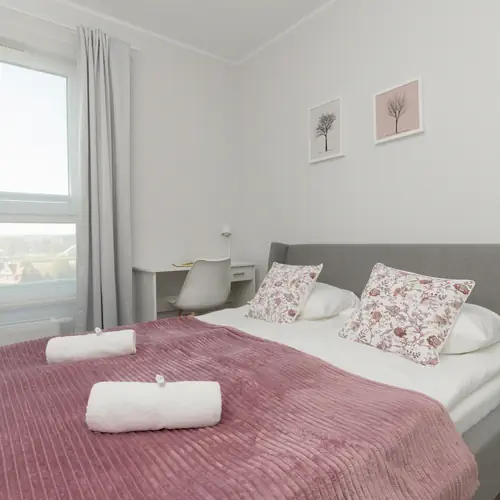 Apartament o powierzchni 41 m² gwarantuje możliwość komfortowego zakwaterowania 4 gości - idealny na pobyt z rodziną lub przyjaciółmi. Funkcjonalna przestrzeń mieszkalna podzielona jest na sypialnię z wygodnym łóżkiem małżeńskim, gustowny salon z rozkładaną sofą, miejscem do siedzenia i aneksem kuchennym, a także łazienkę z prysznicem. W części dziennej znajduje się również wyjście na balkon z niesamowitym widokiem na okolicę. Apartament oferuje stylowe umeblowanie oraz kompleksowe wyposażenie w niezbędne akcesoria kuchenne oraz łazienkowe. Nowoczesny wystrój wnętrza, staranne wykończenie oraz dbałość o detale nadaje mu wyjątkowego charakteru - podkreśla jego wysoki standard oraz sprawia, że aranżacja mieszkania trafi w najbardziej wymagający gust, Komfort pobytu zapewniają również udogodnienia takie jak TV z płaskim ekranem oraz Internet Wi-Fi. Apartament oferuje miejsce do pracy zdalnej – w sypialni znajduje się biurko z lampką oraz wygodne krzesło. Do mieszkania przynależy również miejsce postojowe w hali garażowej.